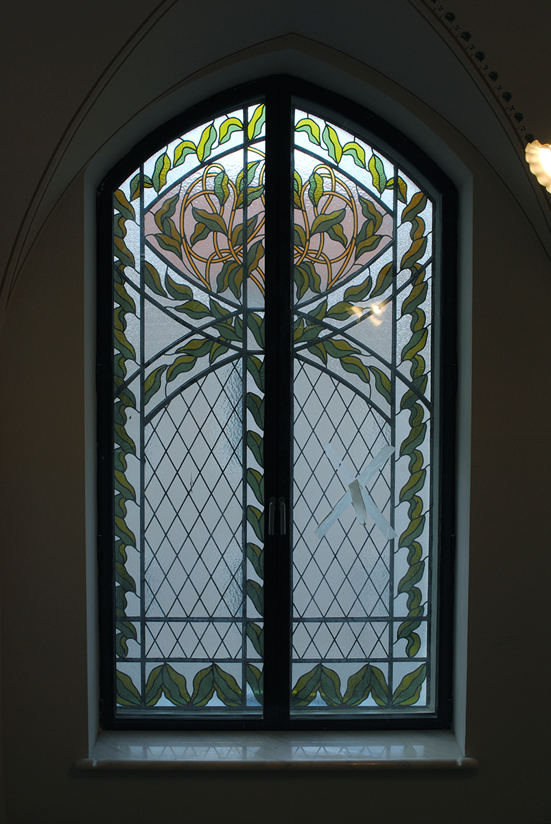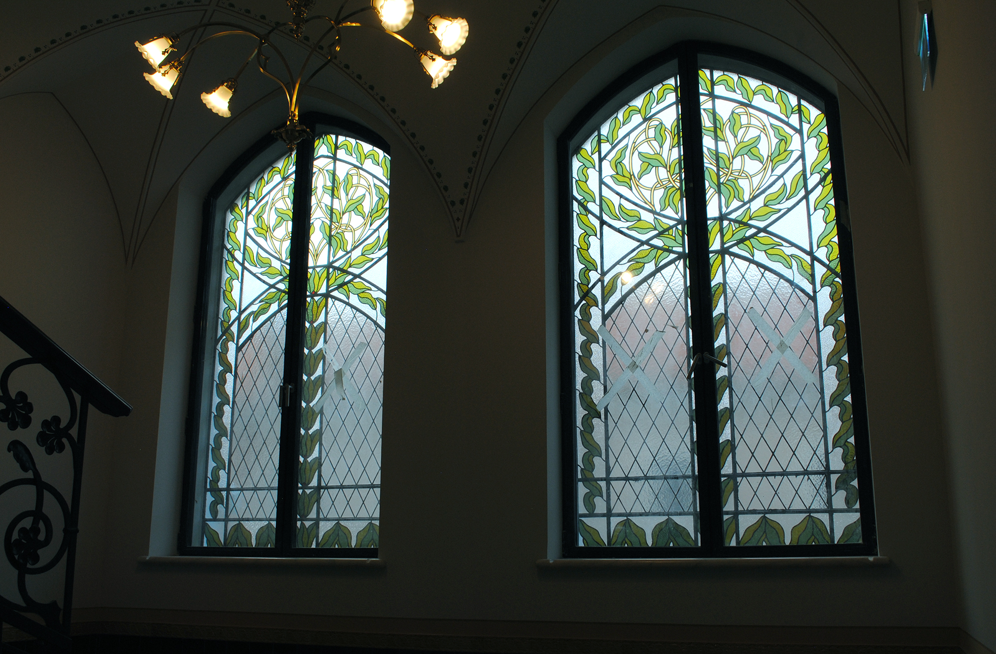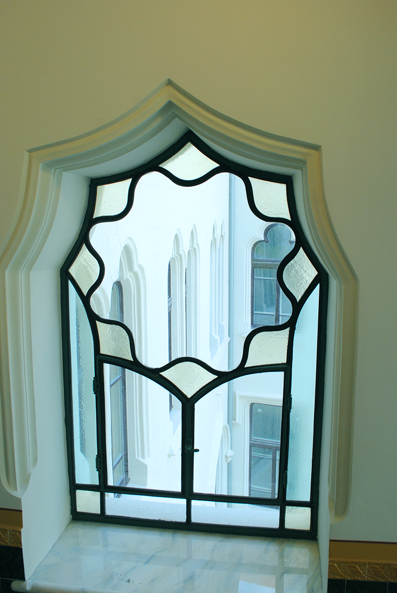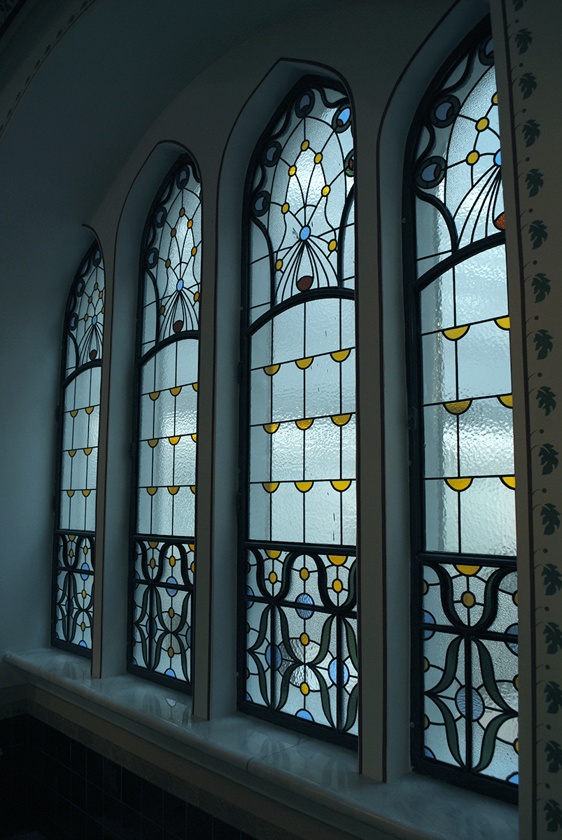 Lépcsőházak ólomüvegei és osztott színes, ablakai